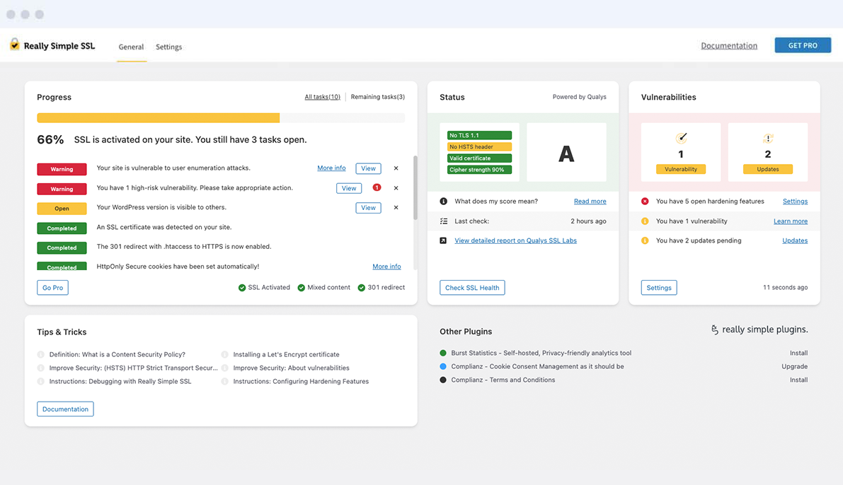 Once an SSL certificate is correctly installed, Really Simple Security will enforce SSL by changing the site URL and implementing the proper 301 redirect to https.